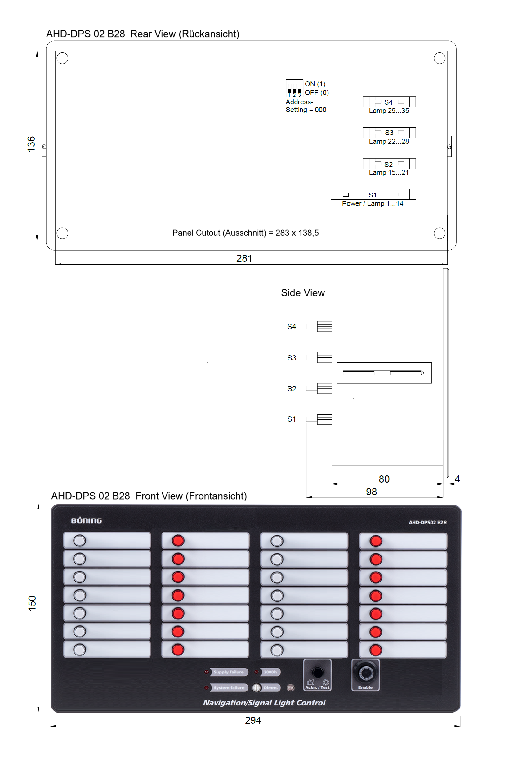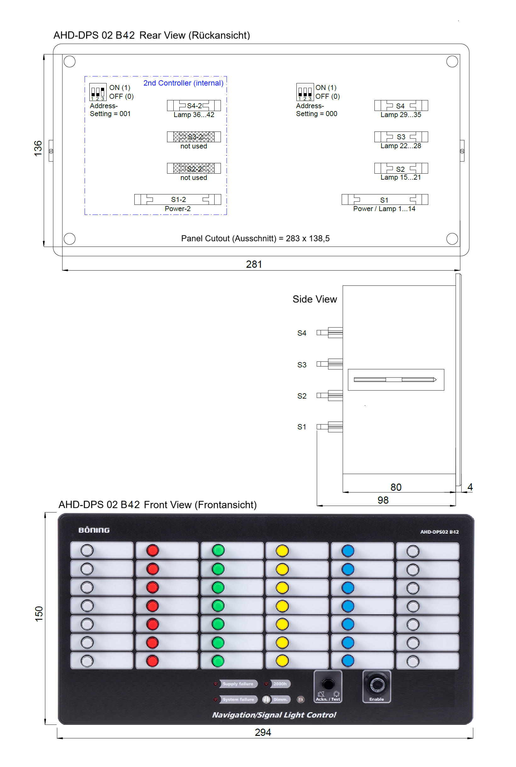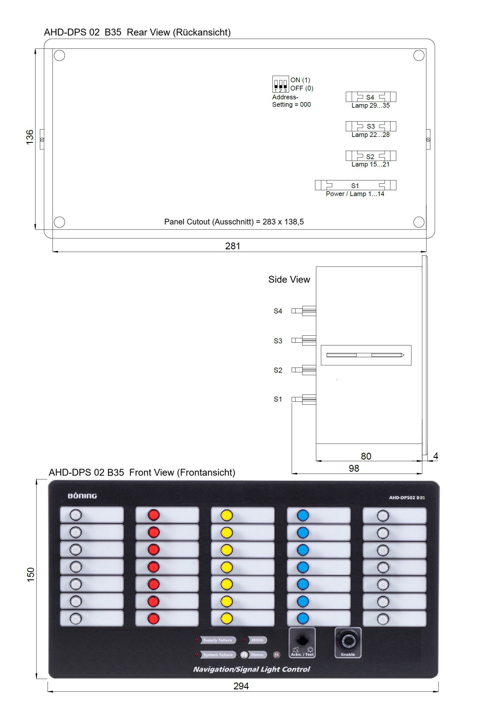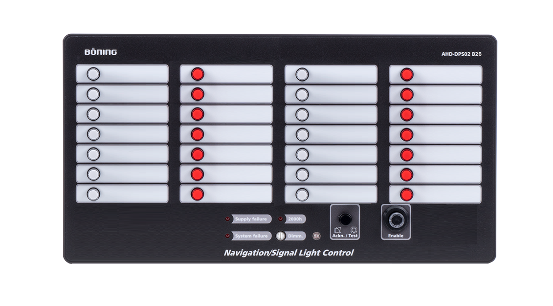 Das modular konzipierte AHD-DPS02 System ermöglicht die Steuerung und Überwachung von bis zu 42 Positions- und Signallaternen an Bord von Schiffen. Das System kann an kundenspezifische Anforderungen angepasst werden. Es besteht aus einem Basismodul, bis zu vier Erweiterungsmodule und einem individuell gestaltbaren Bedienpanel.